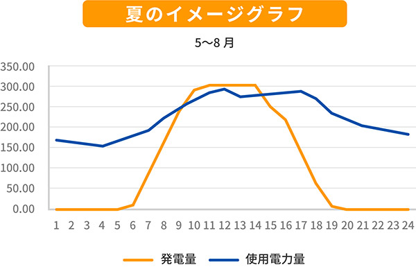 夏は冷房機器などで使用電力量も増えますが、日照時間が長い夏は太陽光発電も発電しやすい時期となっているため、こちらのグラフでは日中の時間帯の使用電力量を大きくカバーできています。