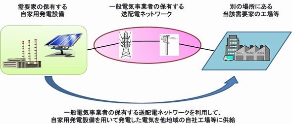 自己託送とは、自家用発電設備を設置する者が、当該自家用発電設備を用いて発電した電気を一般電気事業者が維持し、及び運用する送配電ネットワークを介して、当該自家用発電設備を設置する者の別の場所にある工場等に送電する際に、当該一般電気事業者が提供する送電サービスのことである。(引用:経済産業省)