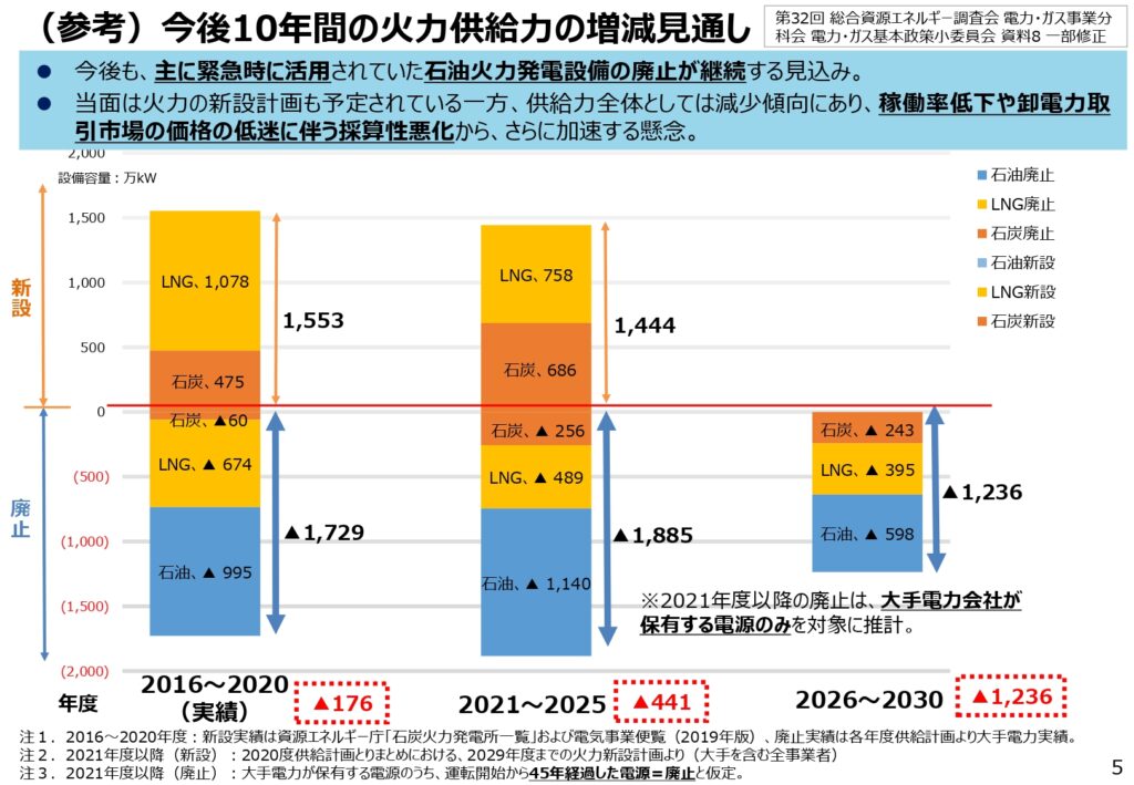 これと合わせて、今後10年間の火力供給力の増減の見通しに関しても見てみましょう。
