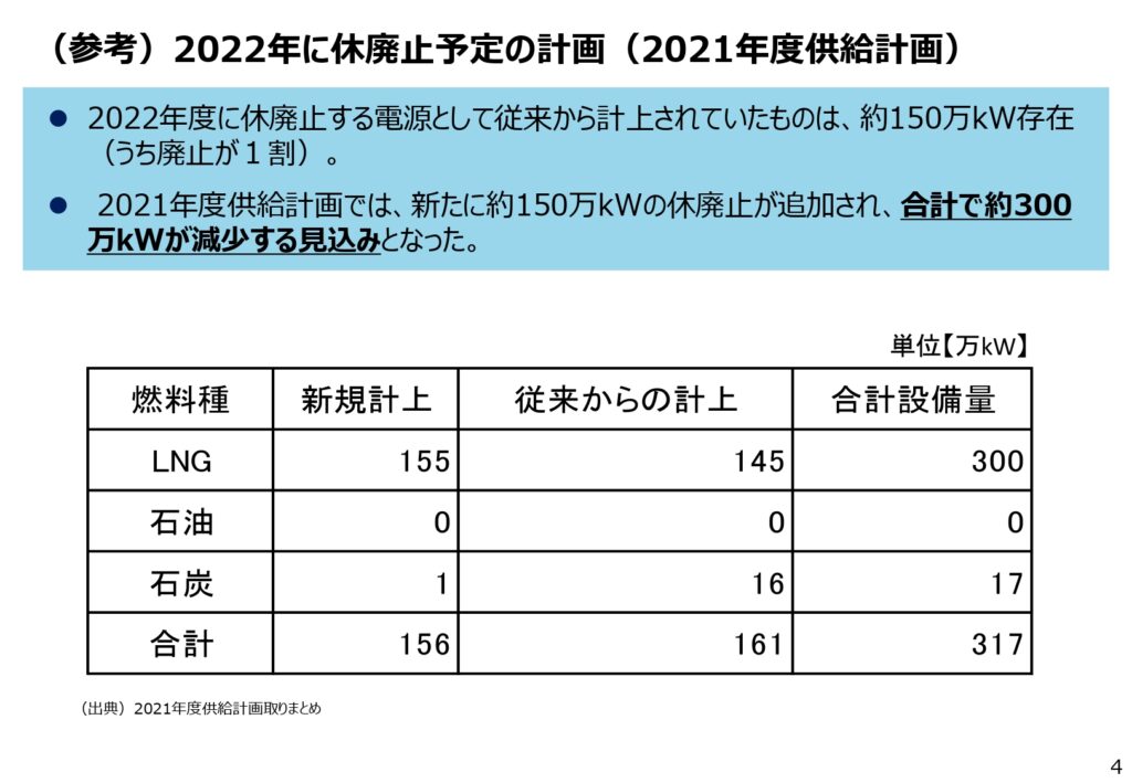 まず火力発電所の動向ですが、資源エネルギー庁が公開している『2022年度の需給見通しと対応策に向けた検討について』の資料を参考にしてみますと、2022年度に休廃止する火力発電所は供給量で表すと約300万kWもの施設が休廃止する見込みとなっています。
