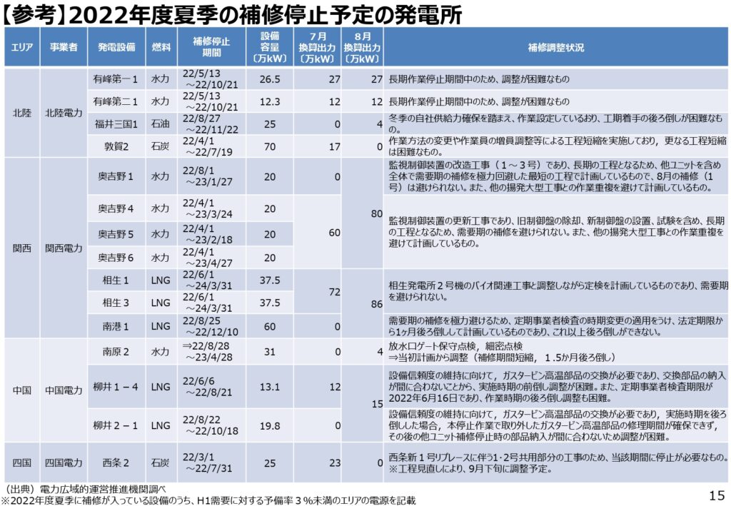 これを見ると春~夏にかけては、毎年様々な発電施設で補修のために休止される発電施設があります。