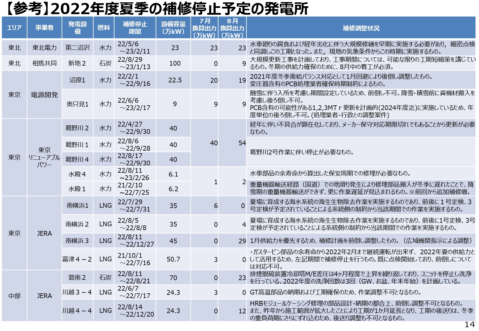 これを見ると春~夏にかけては、毎年様々な発電施設で補修のために休止される発電施設があります。
