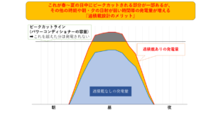 これを行うことにより、朝夕の日射量が少ない時間帯や天気が良くない日でも、太陽光パネルの容量が多いため、