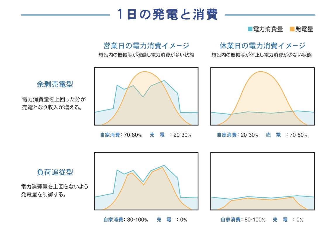 余剰売電を行わない『負荷追従型の自家消費型太陽光発電』の場合は、その建物の消費電力量をちょうどよく