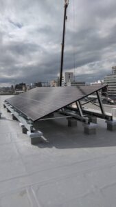 掴んで設置させることの出来ない陸屋根の場合、「(野立てのような)架台を組んで設置する」「陸屋根用の低重心架台で設置する」方法が検討されます。どちらも費用感としては先ほどのハゼ付き折板屋根よりもUPしますし、架台を組み立てる必要がある分、施工にも時間がかかります。