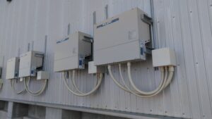 太陽光パネルは新しい建屋の屋根一面に設置を行い、PCSは壁付けとなっています。