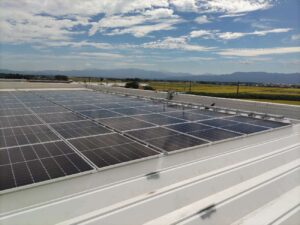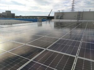 『太陽光パネル』は会社の屋根上へ固定金具で設置し、太陽光パネルで発電した電気を使える形に変換する『パワーコンディショナー』はお客様の変電設備(キュービクル)の近くに設置となりました。