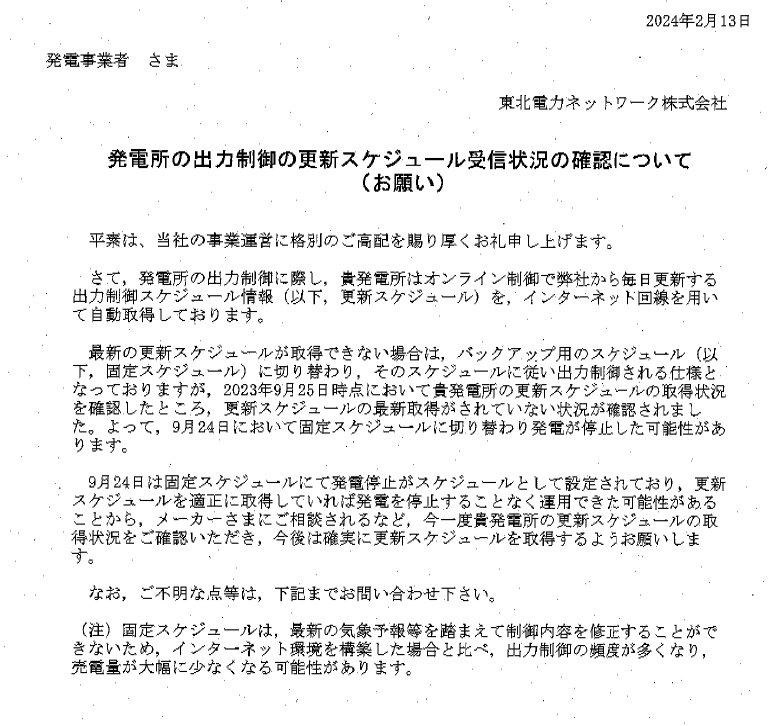 ※こちらは参考までに、発電事業者様から弊社宛にご共有頂いた書面の写しです。