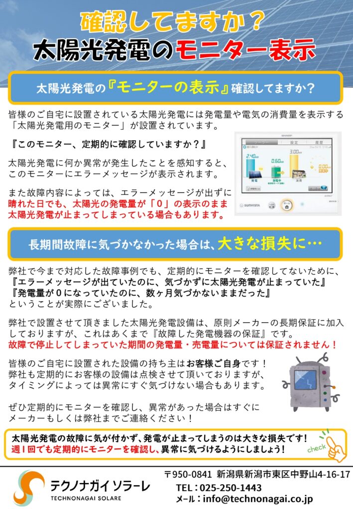 ぜひ、定期的に設備の運転状況を確認したり、太陽光発電のモニター表示を確認し、
