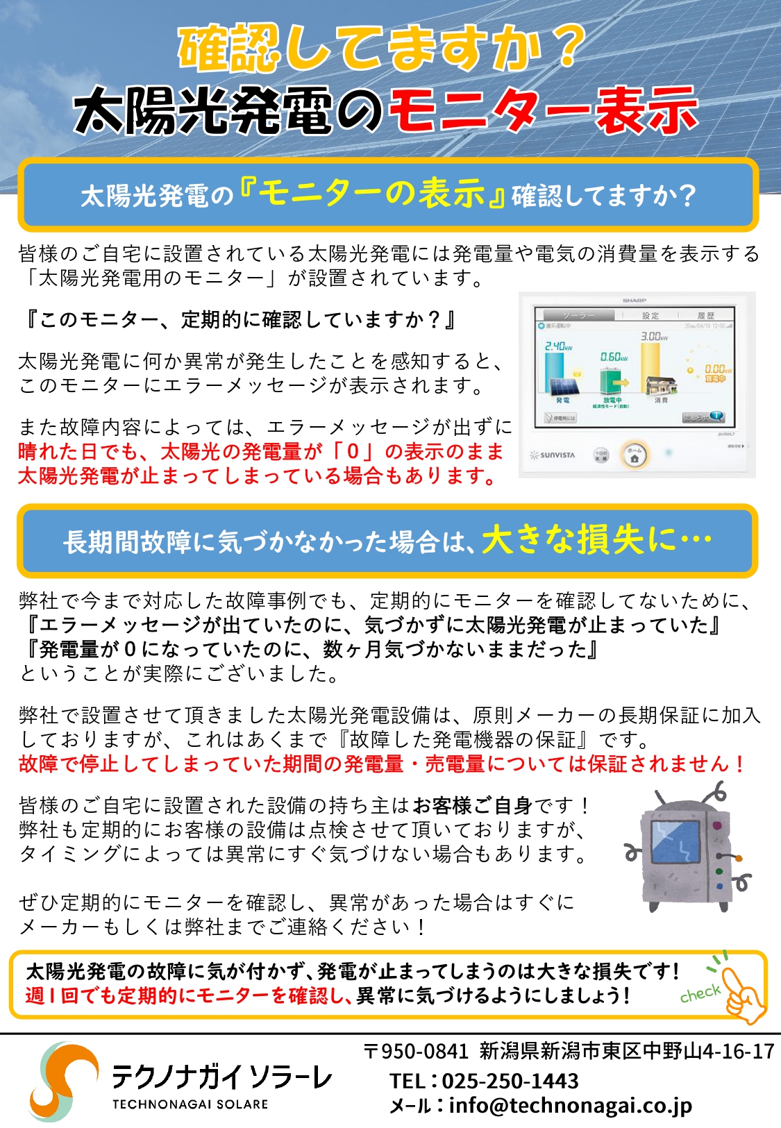 ぜひ、定期的に設備の運転状況を確認したり、太陽光発電のモニター表示を確認し、