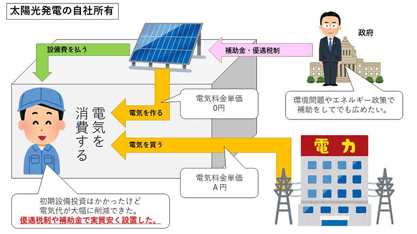自社所有の場合はこの図のように、太陽光発電設備の設備費を自己負担して設備を設置します。