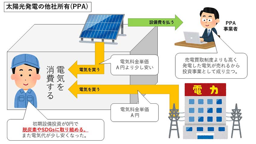 これにより、PPA事業者は固定買取制度より高い金額で発電した電気を売ることができ、法人様は再生可能エネルギーを設備費用をかけずに導入することができ、PPA事業者より電力会社から電気を買うより安い値段で電気を買うことが出来るというメリット生まれます。