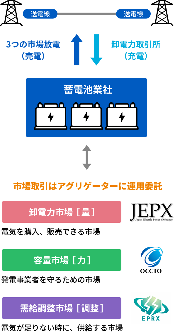 系統用蓄電池は卸電力取引所より電気を購入し、